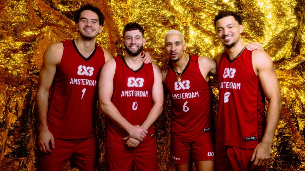 Team Amsterdam RABOBANK had geen perfecte dag één op de World Tour Finals in Manama. Maar het was goed genoeg. Jan Driessen, Maarten Bouwknecht, Worthy de Jong en Bryan Alberts (v.l.n.r., foto via FIBA3x3) spelen later vandaag de kwartfinale van het laatste 3×3 toernooi van dit jaar.