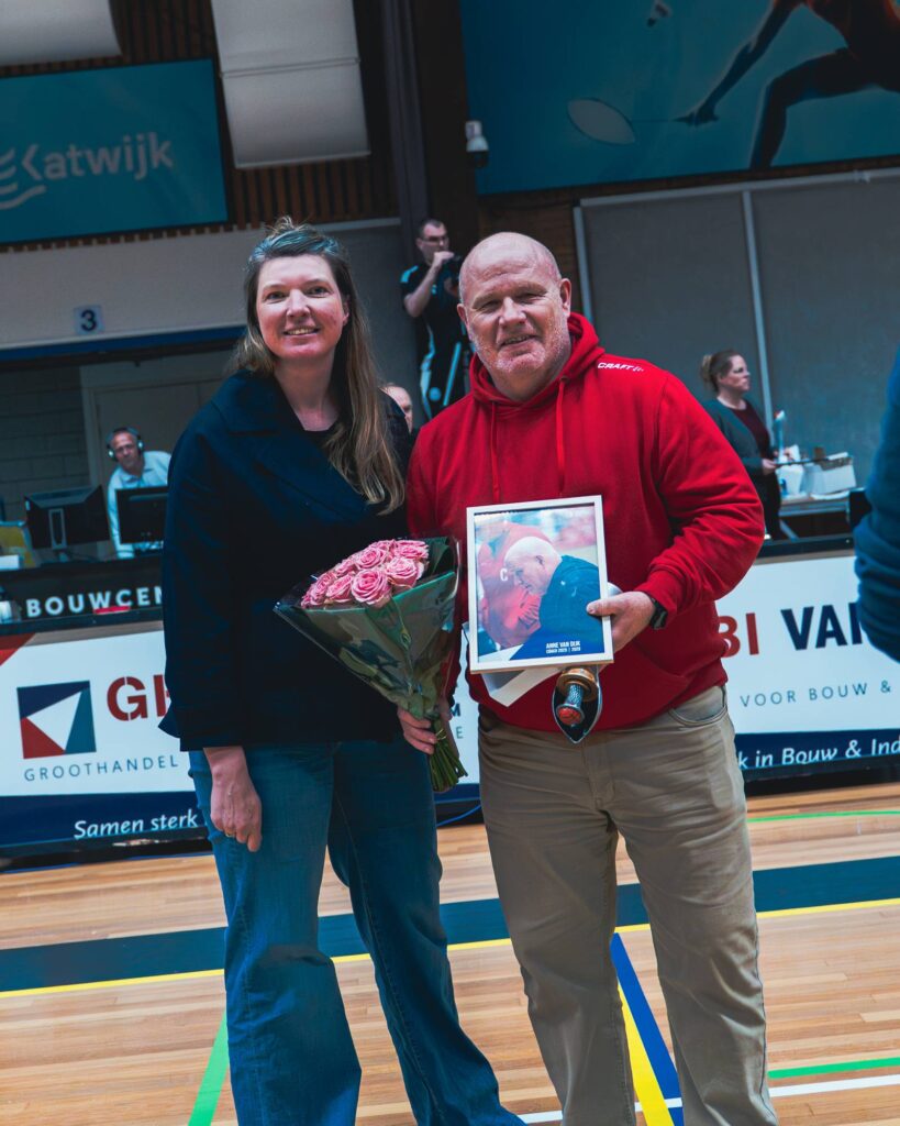 Namens het team hebben we nog één klein verzoek: Nu jij bent uitgeroepen tot Coach van het Jaar en ook volgend seizoen aanblijft als onze coach, willen we graag – in het bijzijn van basketballend Nederland – een afspraak maken: dat wij de tipdrill nooit meer hoeven te doen.”