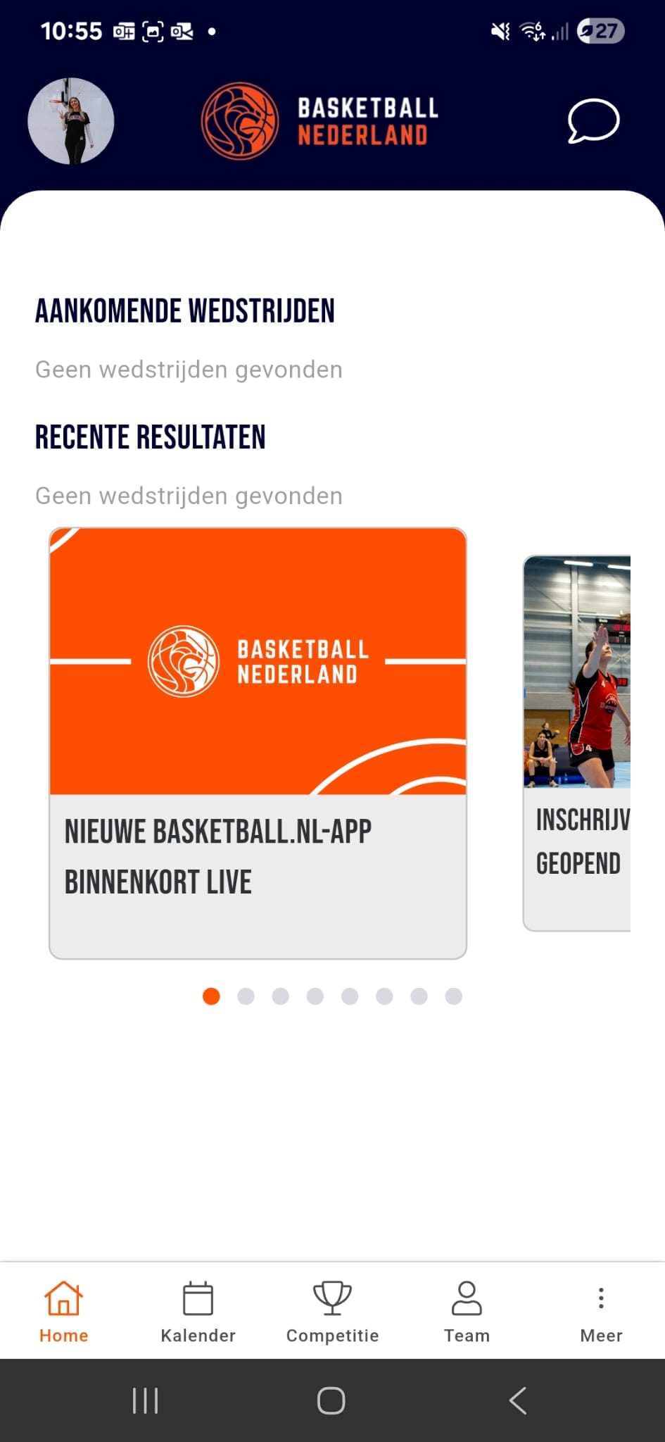Op het ‘Home’ scherm zijn de nieuwsberichten van de NBB en jouw vereniging te zien. Welke verenigings nieuwsberichten je ziet, is afhankelijk van de vereniging waar je bent ingelogd.