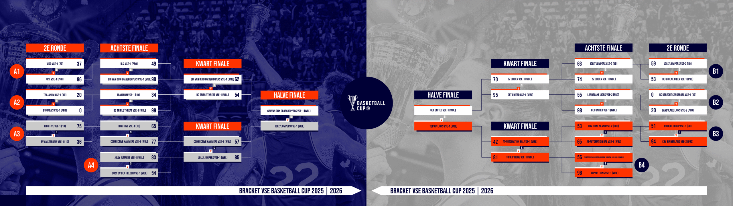 Via onderstaande toernooischema’s wordt de weg naar de finale visueel weergegeven. Het definitieve wedstrijdprogramma en de uitslagen zijn via de BASKETBALL.nl-app te volgen.
