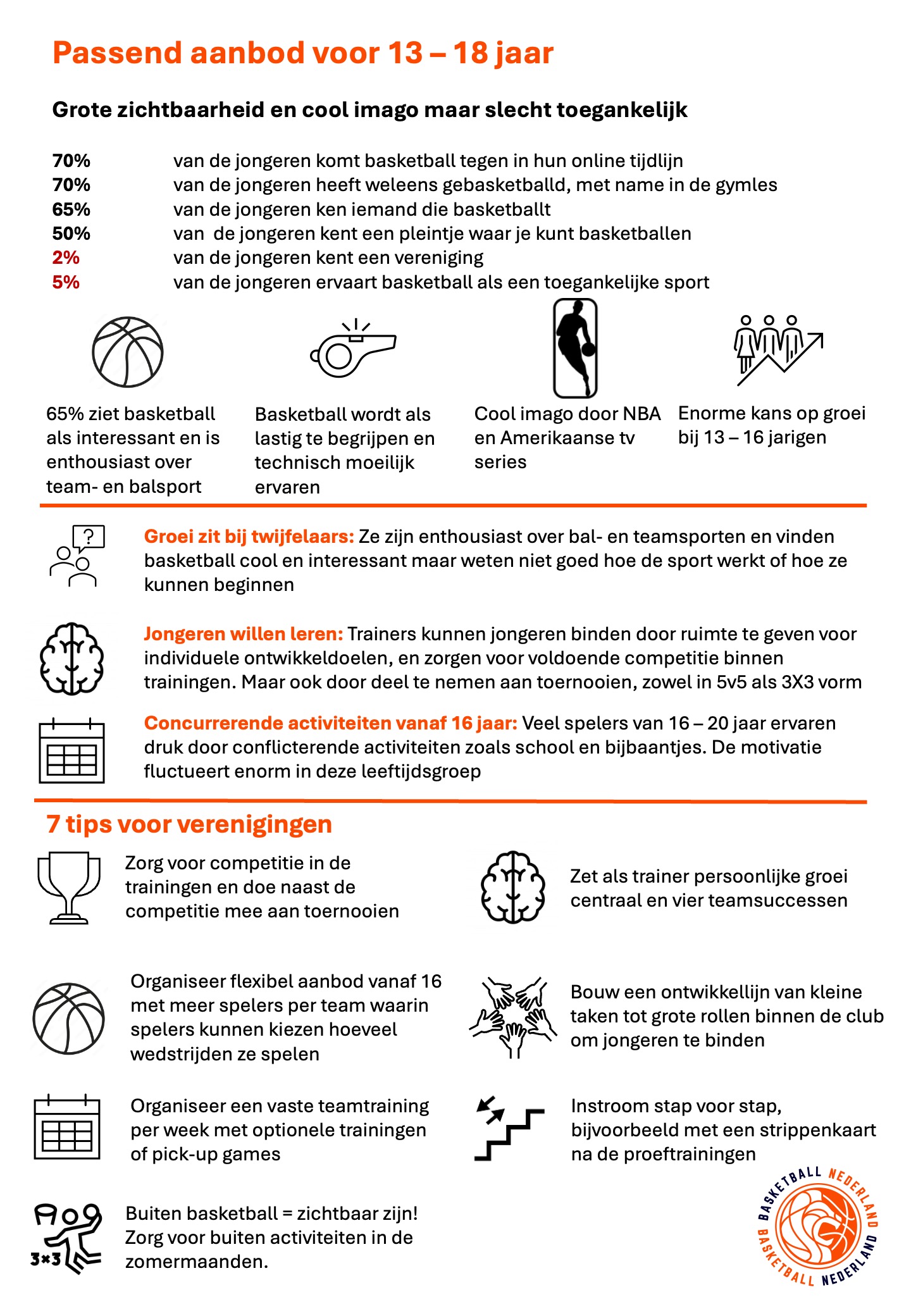 Zo’n 5 procent van de jongeren is enthousiast basketballer. Deze ‘Lovers’ kennen de sport en zoeken actief naar een vereniging. ‘Haters’ hebben geen interesse in team- of balsporten. Maar een overgrote groep jongeren bestaat uit ‘Twijfelaars’: zij vinden basketball interessant, houden van team- en balsporter, maar weten simpelweg niet goed hoe ze moeten beginnen.